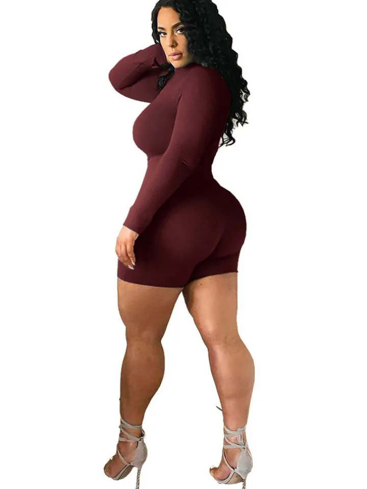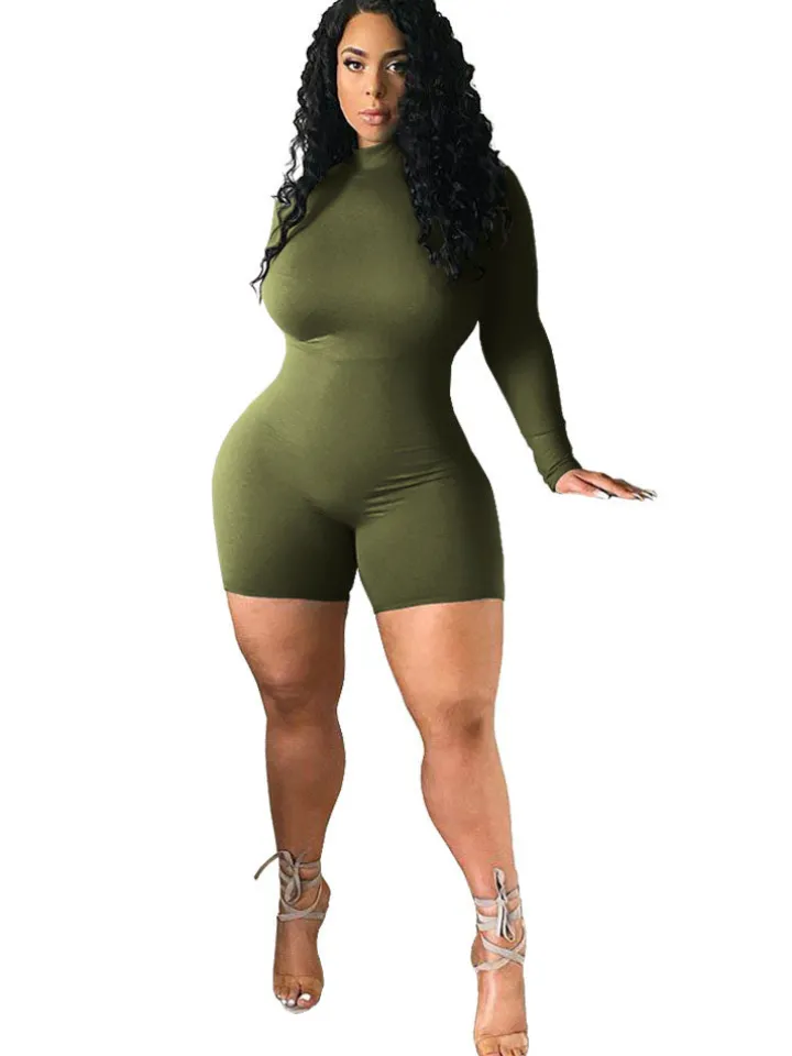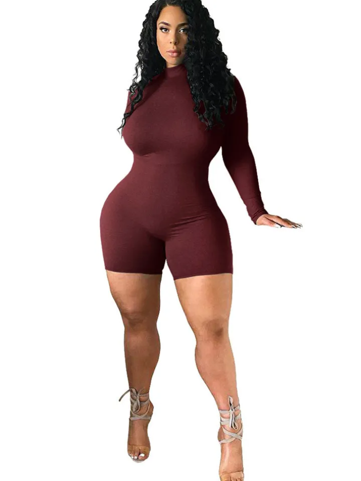 Features: High waist, bodycon, long sleeve, mock neck, solid color, jumpsuit.