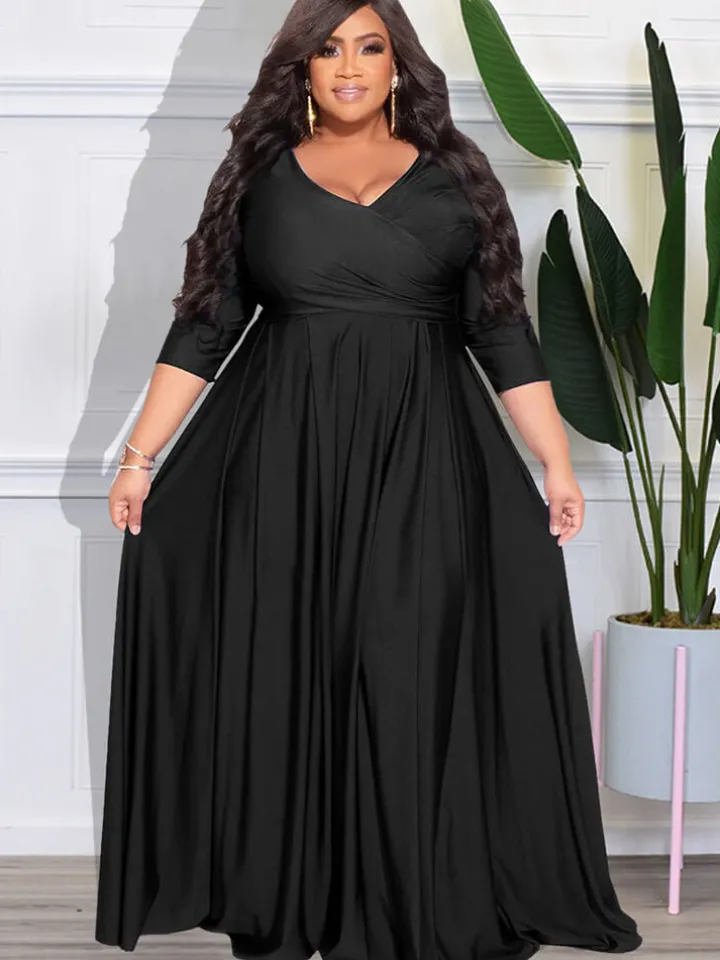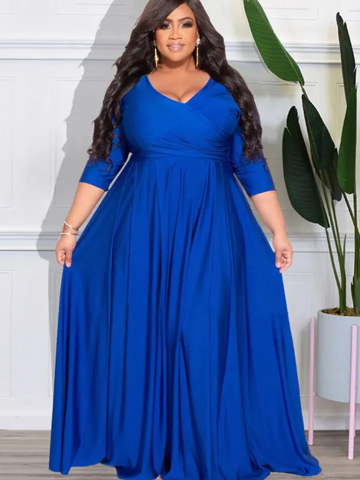 Feature: Bracelet sleeve, v-neck, ruched, solid color, ruffle, maxi dress. Unique style makes you fashionable.