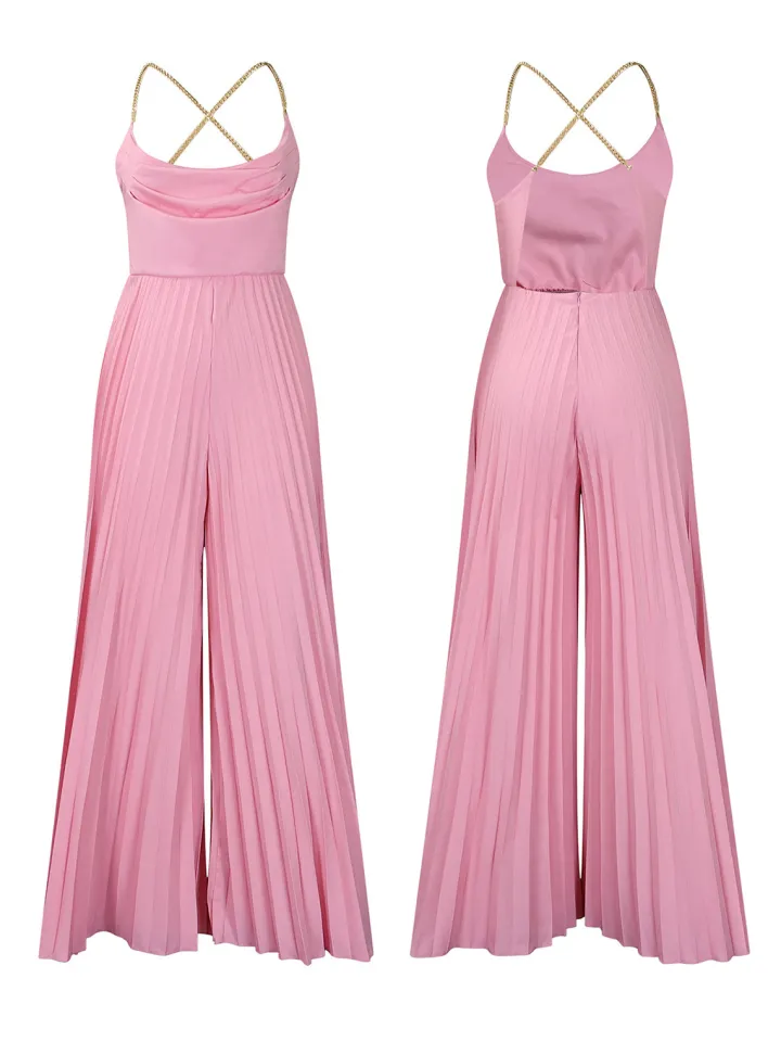 - Top: Chain halter, open back, sleeveless