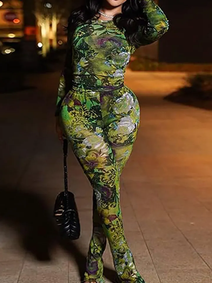 Crew Neck Mesh Tops Pants Sets