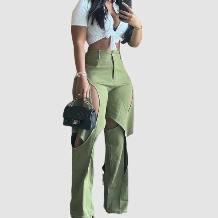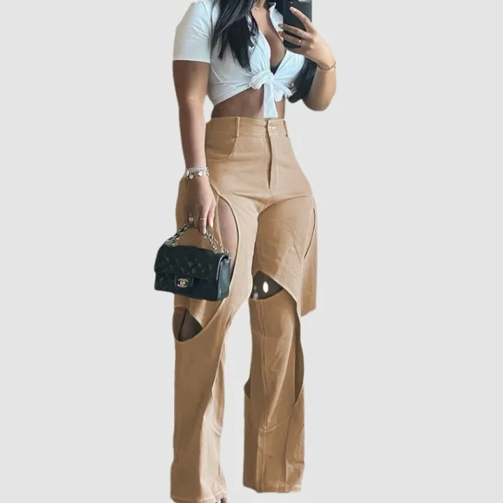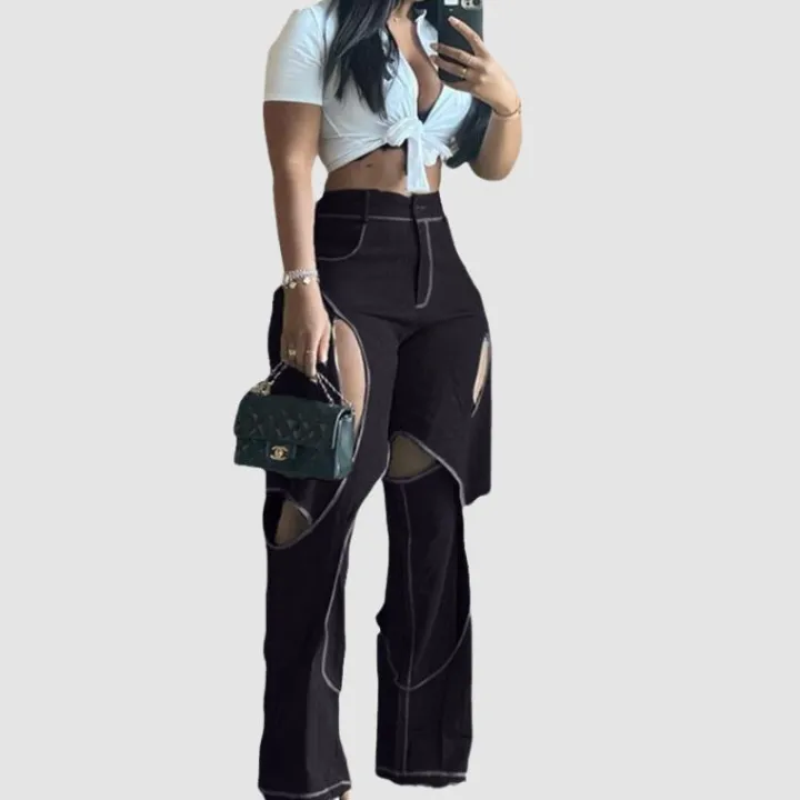 Features: Pants, jeans, ripped design, crossover design, denim fabric, high waist, straight-leg, wide leg, relaxed fit, solid color, zipper front, unisex, couple outfits.