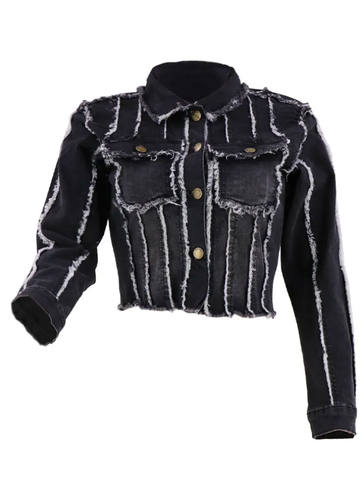 Features: Denim, long sleeves, button, stretchy, ripped, striped, short jackets.