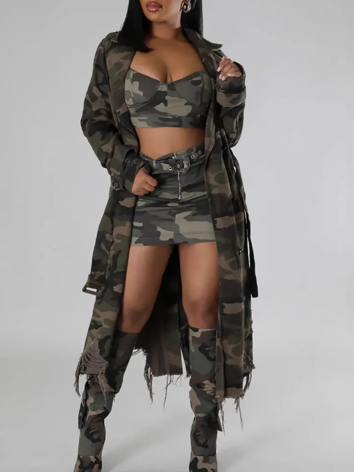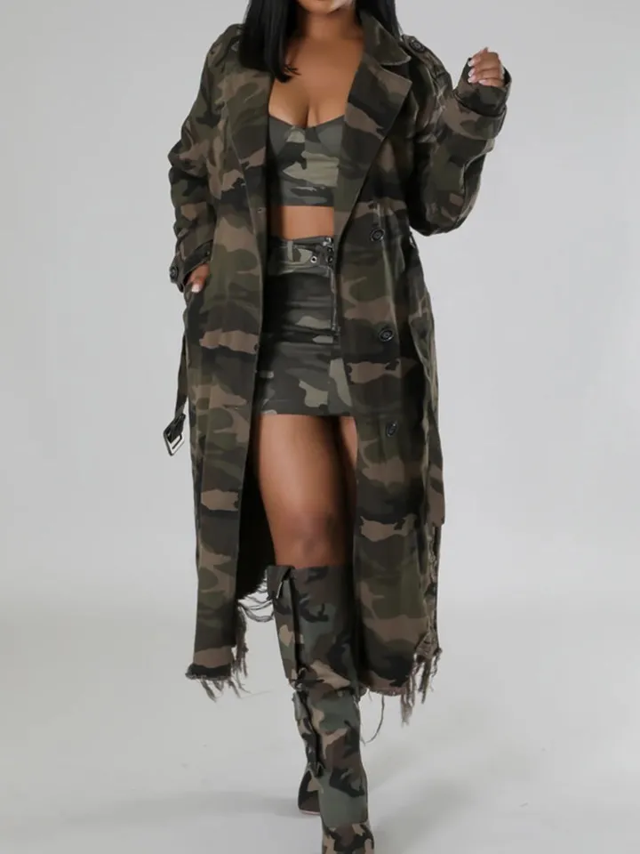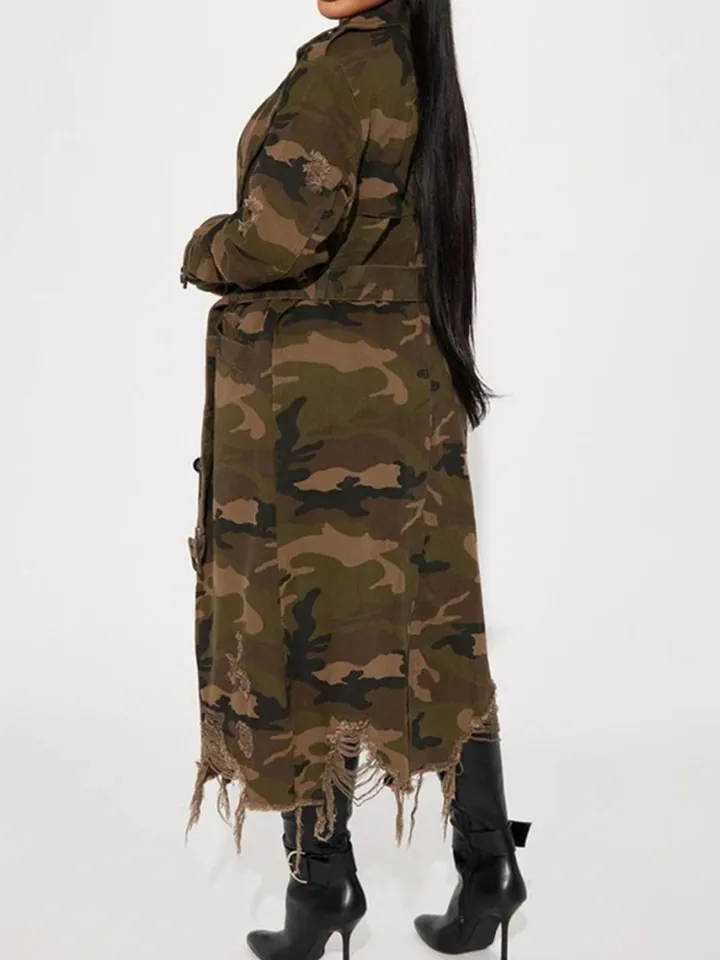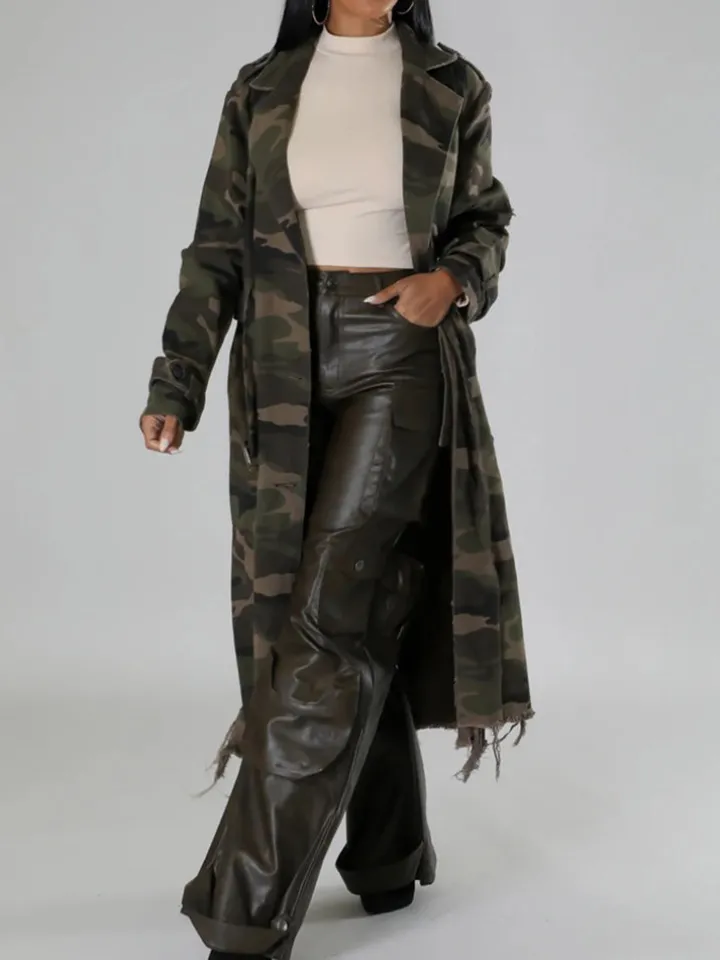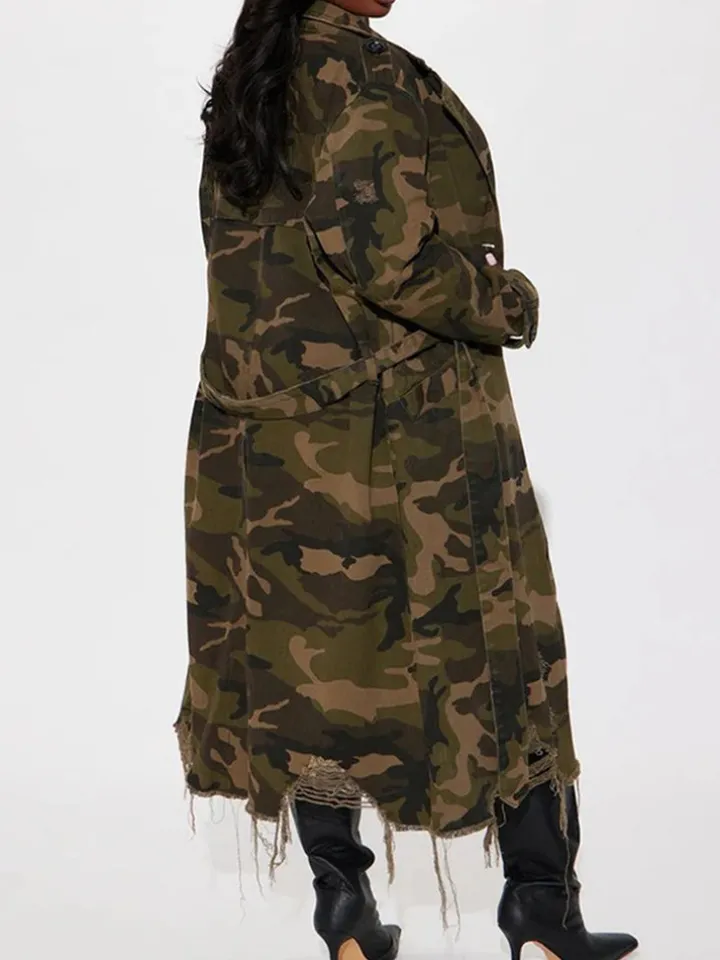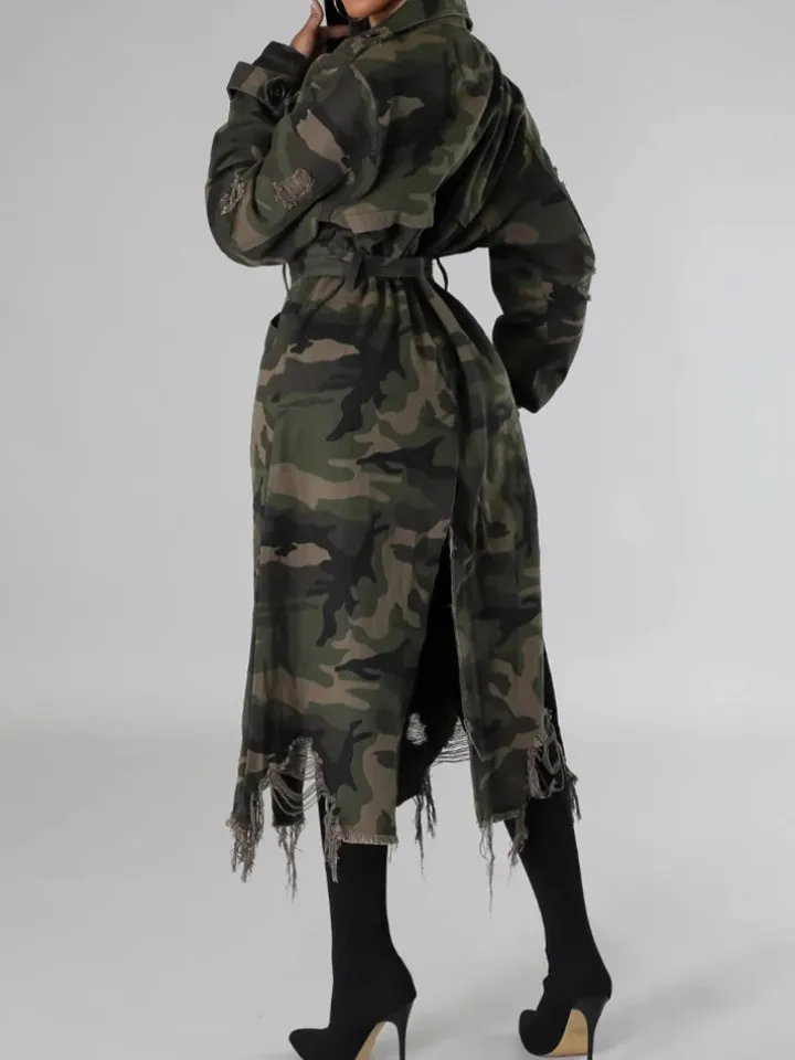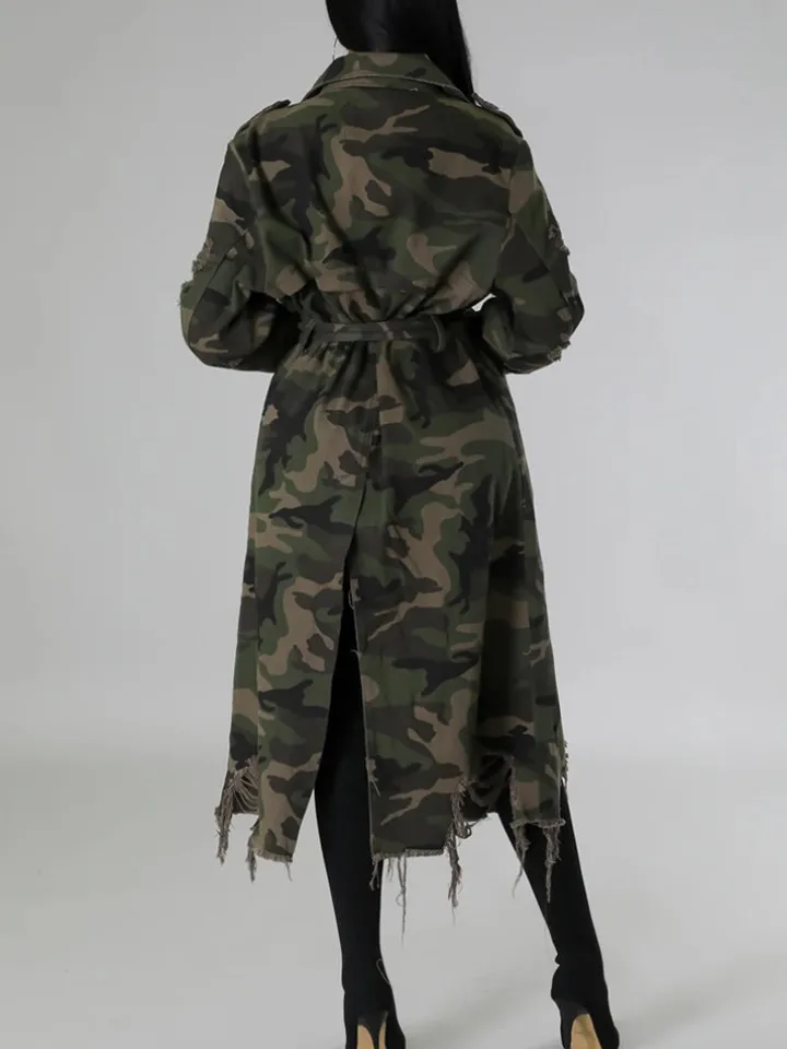 Distressed Camouflage Long Trench Coat