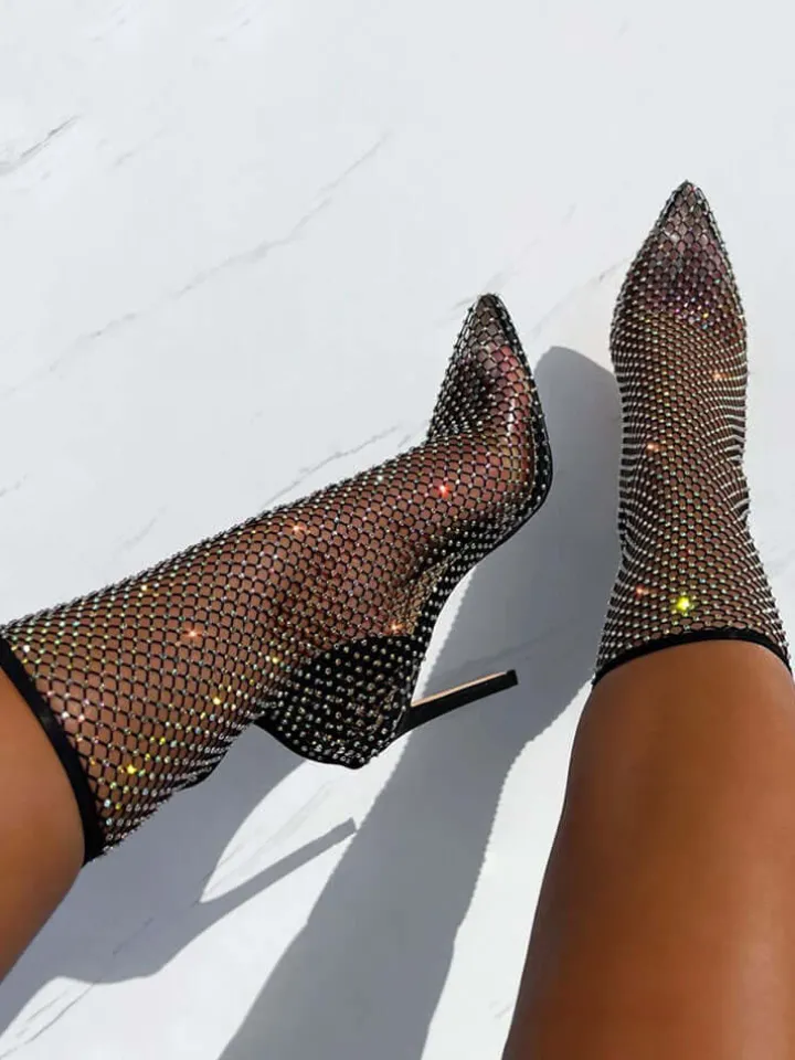 Fishnet Hollow Out Rhinestone Heel Boots