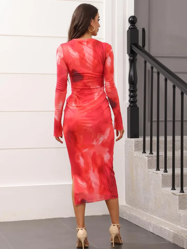 Feature: Tie dye/ bohemian pattern, crew neck, flare split sleeve, ruch details to cover belly, long sleeve, see-through mesh, tight fitted dress, midi dress, side split hem.