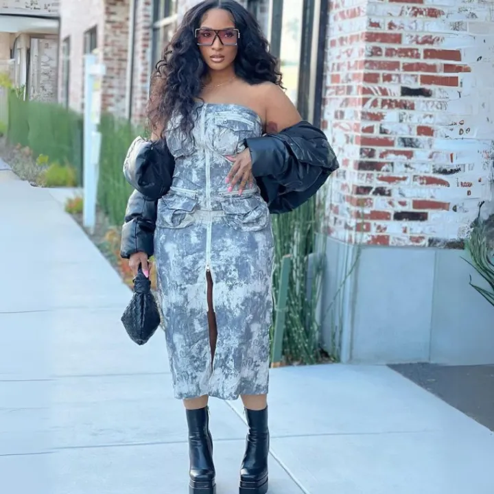 Features: Dress, strapless, zipper, graffiti design, pocket patch, sleeveless, color contrast, bodycon, midi dress.