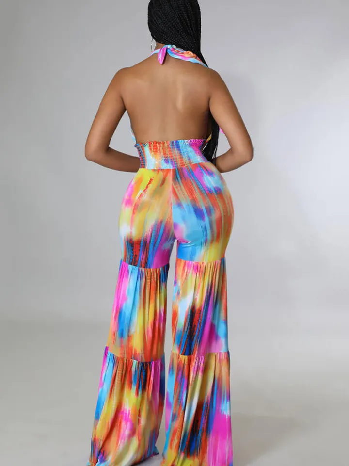 Halter Neck Backless Tie Dye Wide Leg Jumpsuit