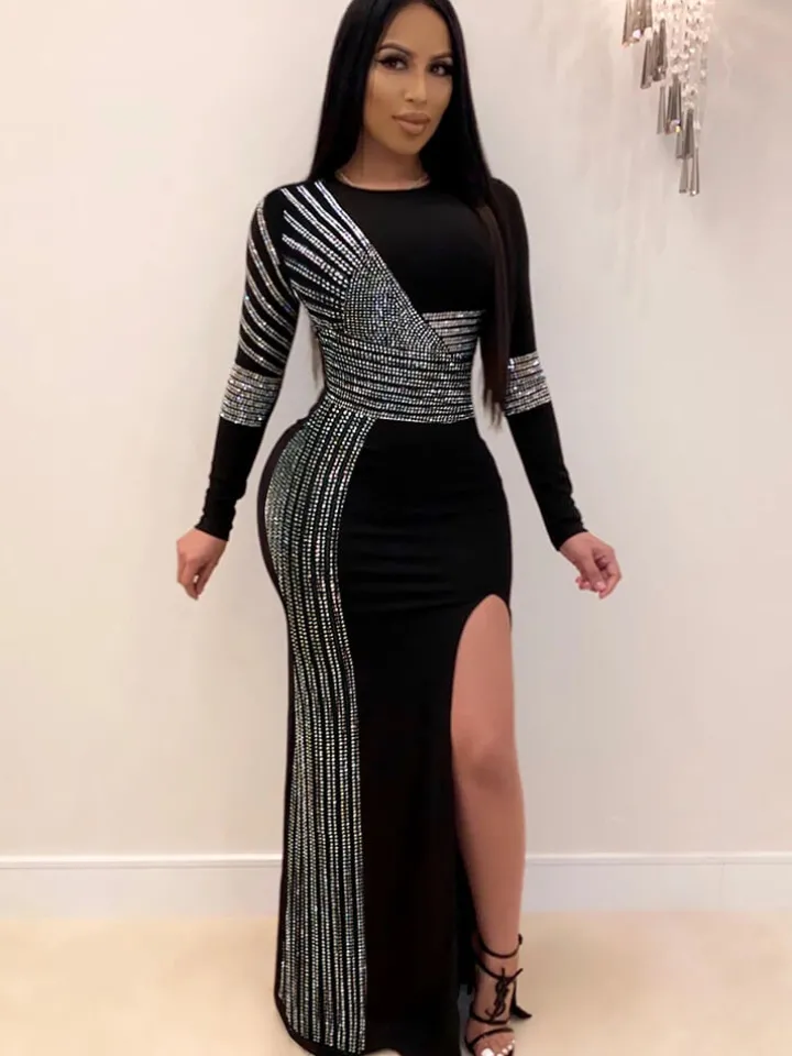 Feature: Round neck, long sleeve, full of stretch, not see-through, high split, back zipper closure, sparkly rhinestone embellishment glittery rhinestones, hot drilling.