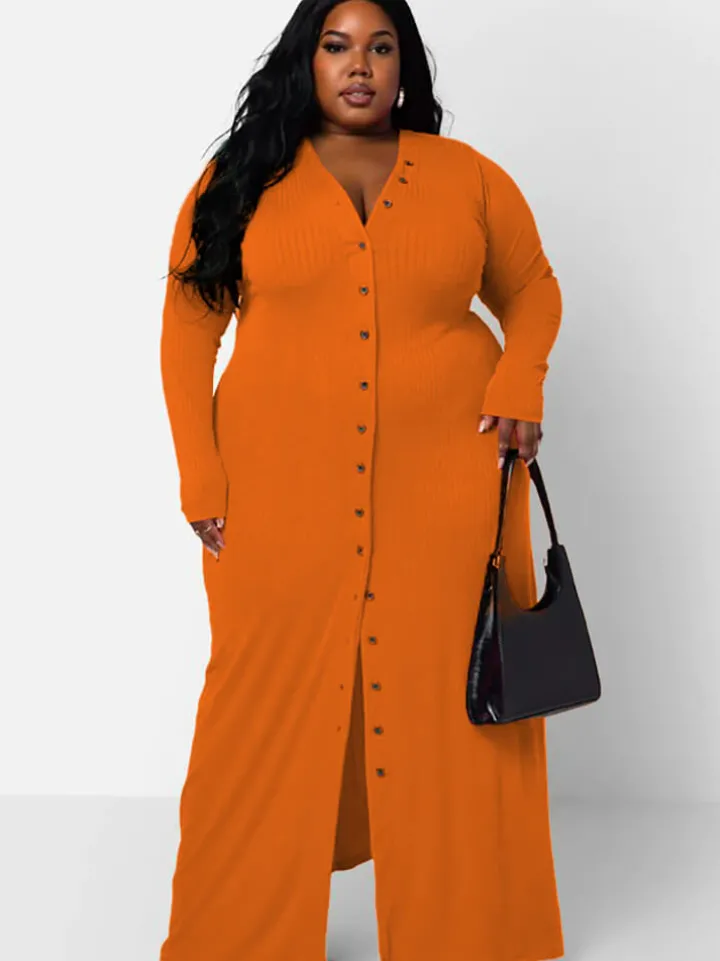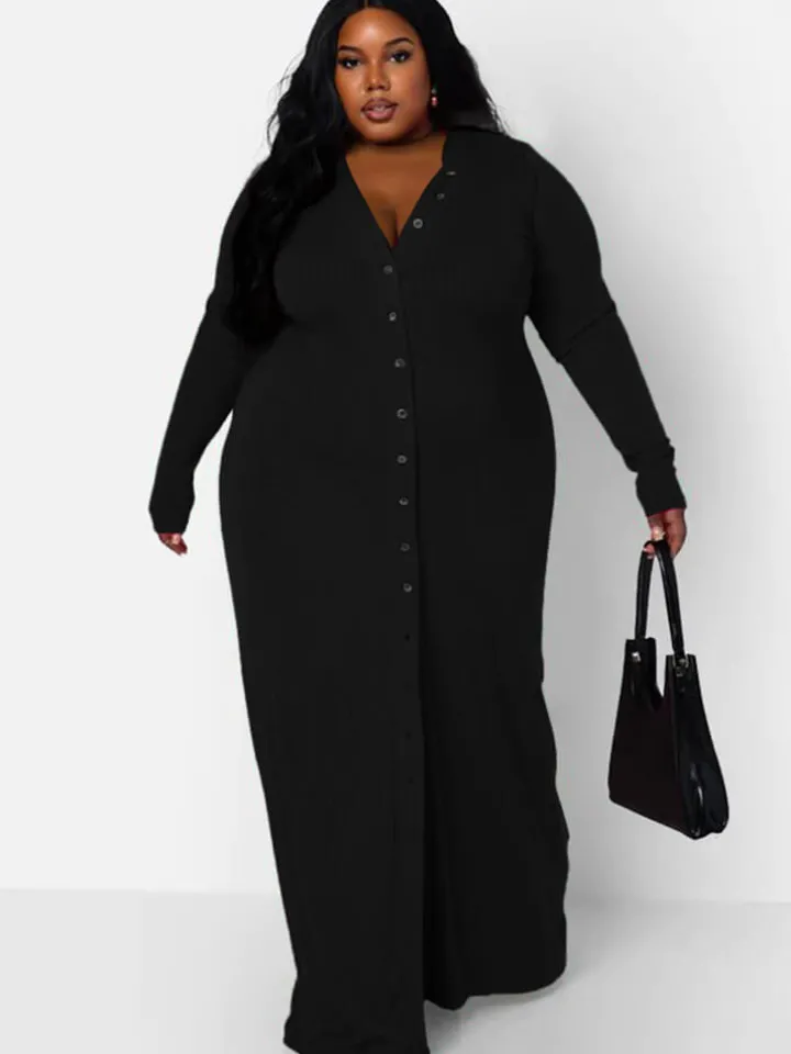 Feature: Long sleeve, solid color, v neck, ribbed, button down, bodycon, maxi dresses