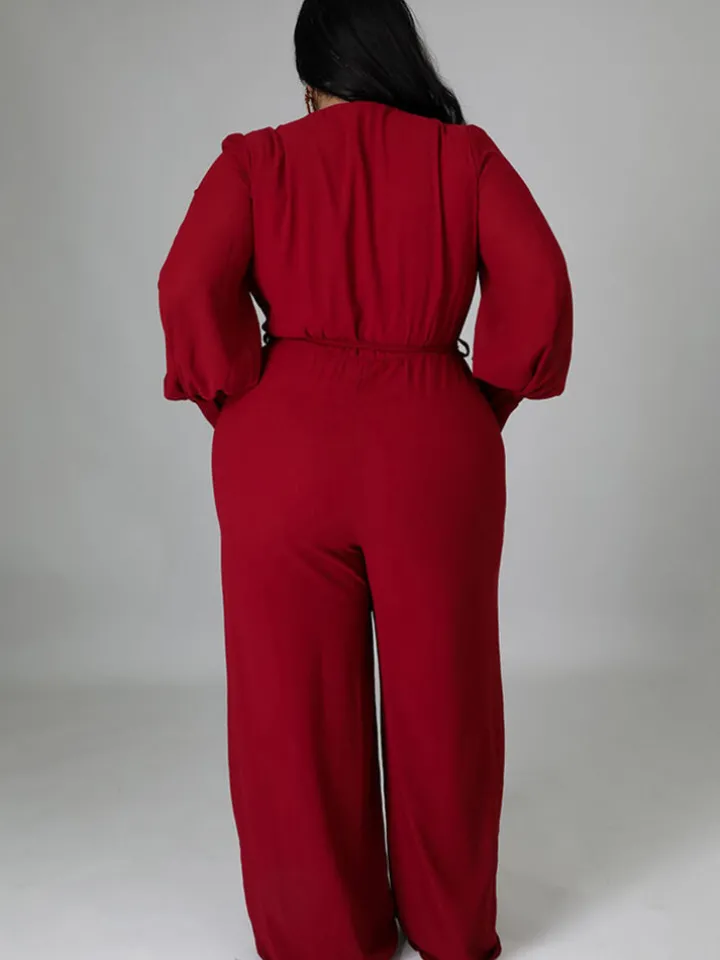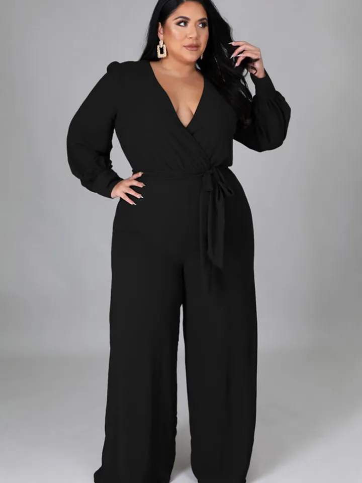 Feature: Solid color, long sleeve, v-neck, tie up, ruched, bodycon, wide leg jumpsuits.