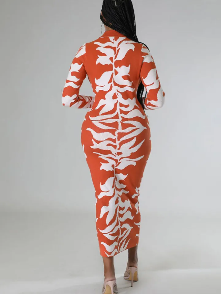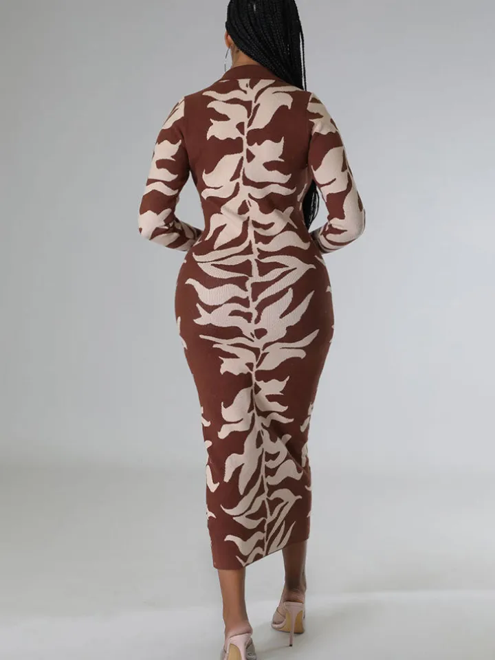 Features: Long sleeves, lapel, print, button-down, bodycon midi dress.