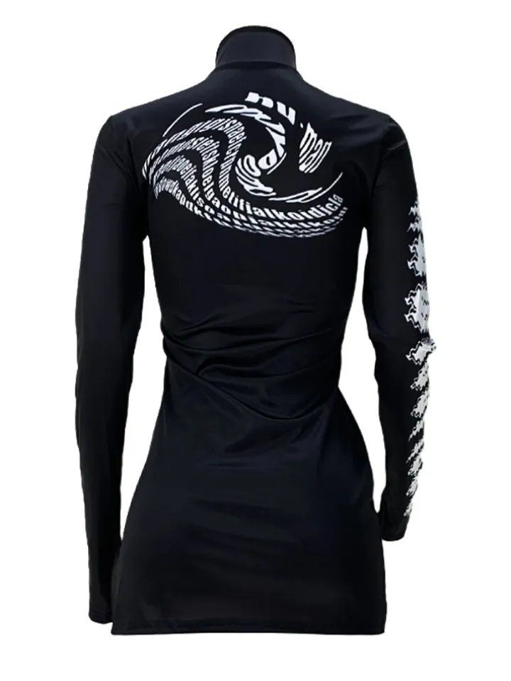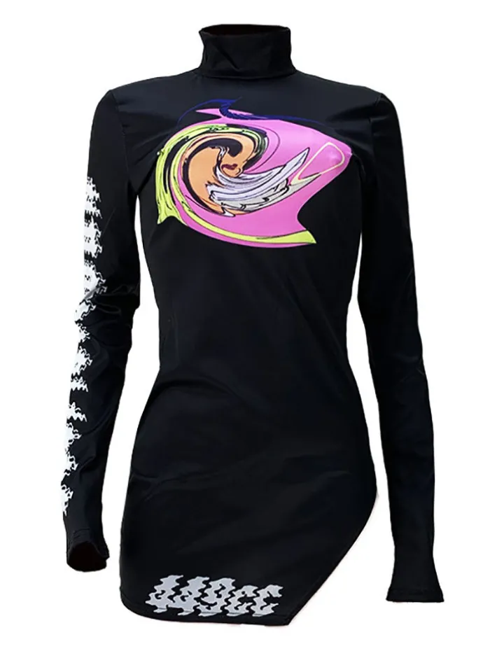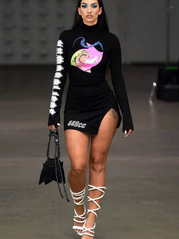 Features: Long sleeves, mock neck, print, side split, bodycon mini dress.