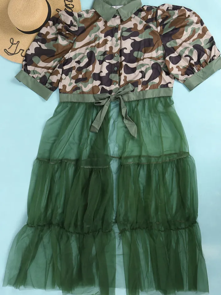 Features: Short sleeve, v-neck, patchwork, camouflage, button, mesh, ruffle, ruched, cover-up, see-through, belt.