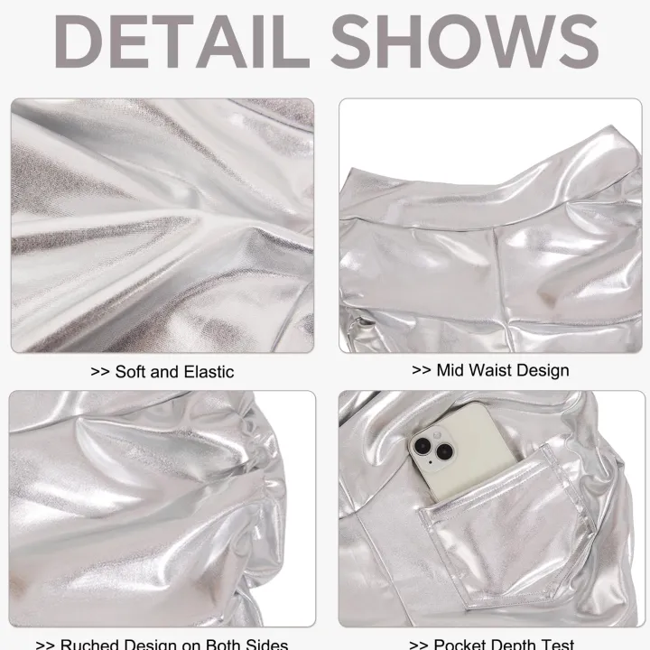 Feature: Shorts, metal coated fabric, with excellent elasticity, solid color, side ruched, v back design, with a pocket on the back for storing mobile phones and other items.