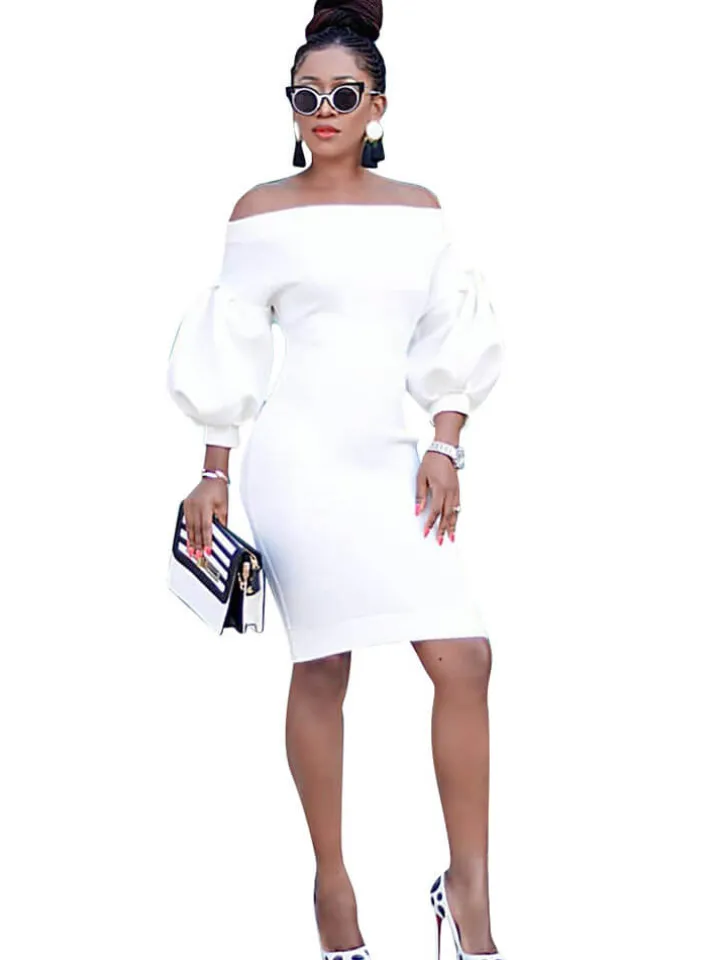 Features: Solid color, long sleeve, lantern sleeve, off-shoulder, slim fit midi dress.