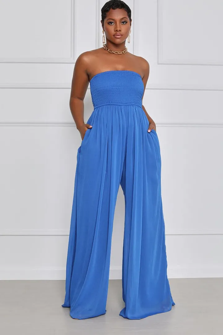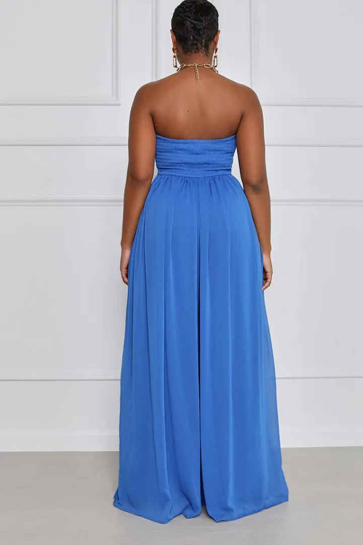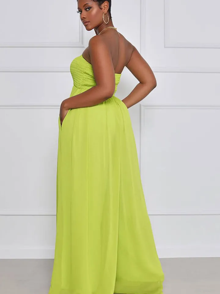 Features: Sleeveless, off-shoulder, solid color, high waist, flare bottom, floor-length, loose fit, one-piece jumpsuits.