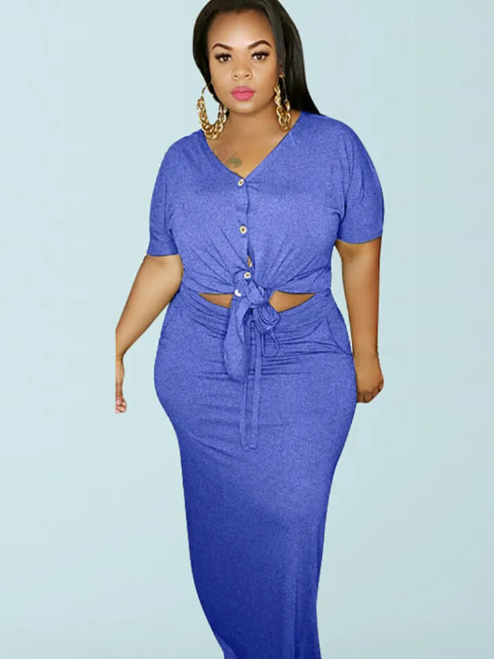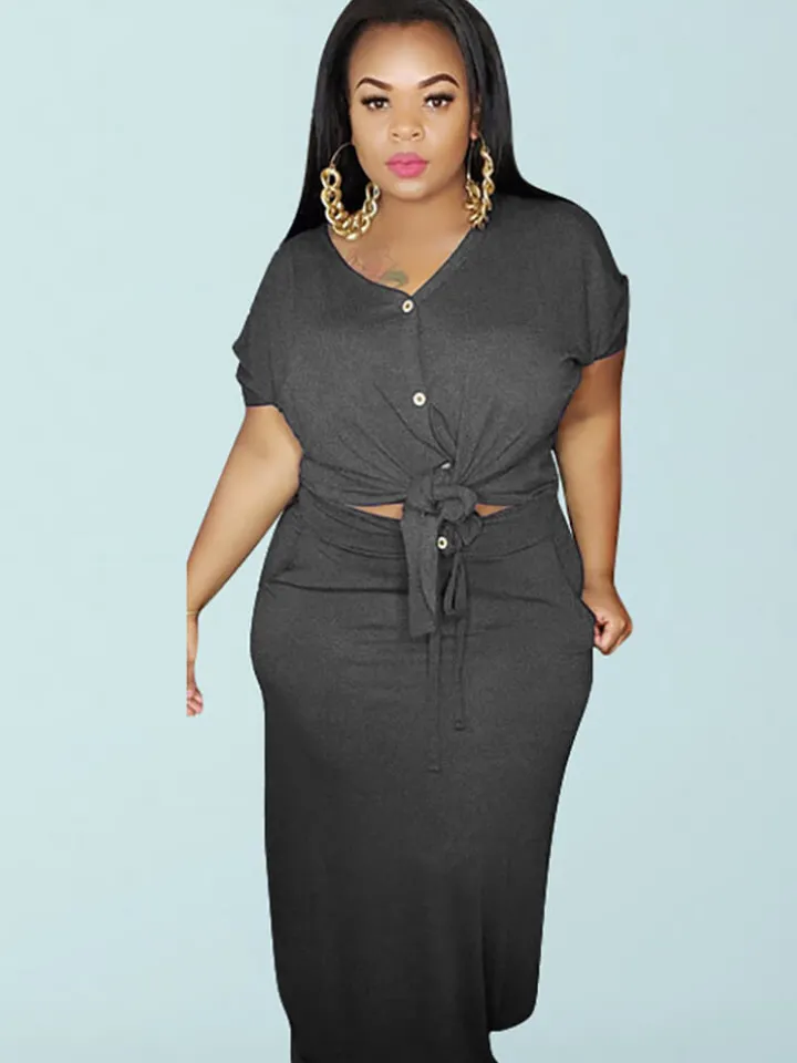 - Feature: Solid color, plus size, slim fit, 2 piece midi pencil dress outfits, short sleeve, button-down v neck, twist know bandage tie up crop top, elastic waist, high waisted midi maxi skirt set.