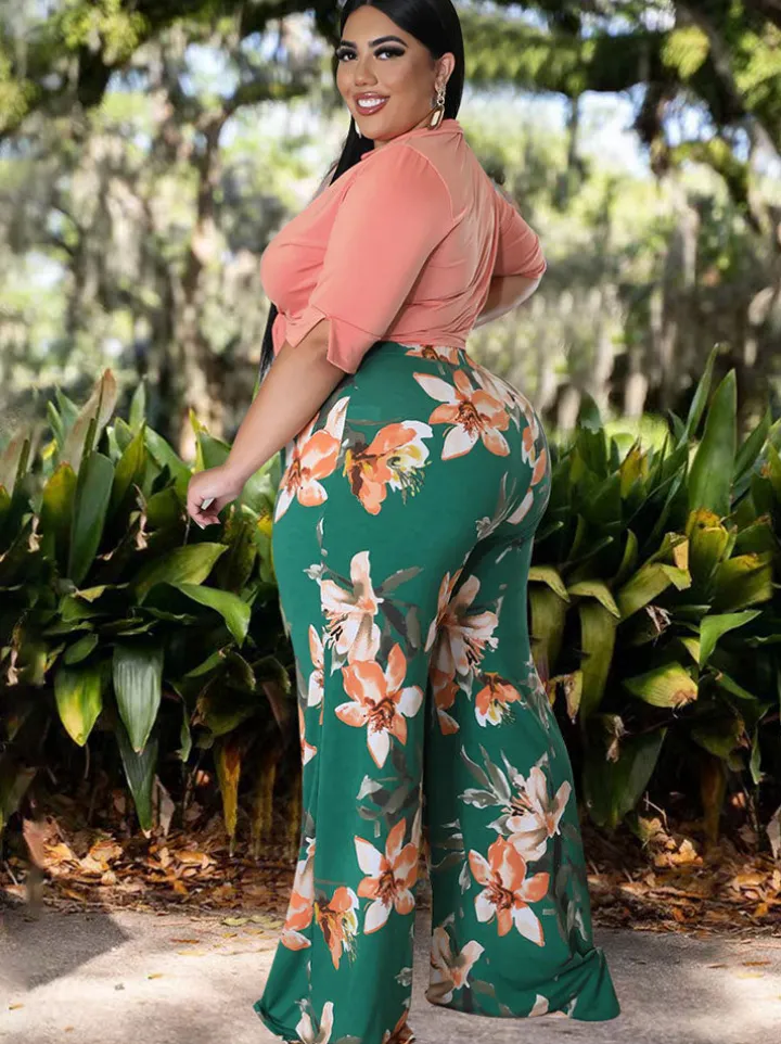 Feature: Plus size, short sleeves, v nck, lapel, lace-up, crop top, high waist, floral print, floor-length, wide-leg, long pants.