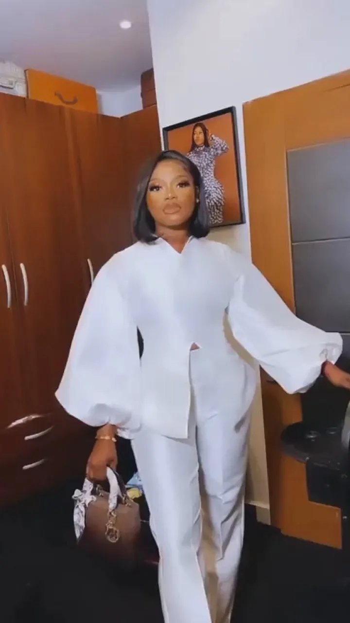 - High-waisted, straight-leg trousers in matching white give a polished, elongated silhouette. The clean lines complement the statement sleeves.