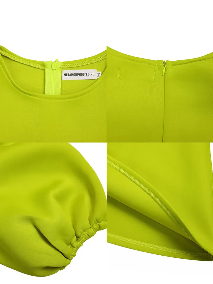 Feature: Puff sleeve, short sleeve, ruched, round neck, solid color, bodycon, midi dresses.
