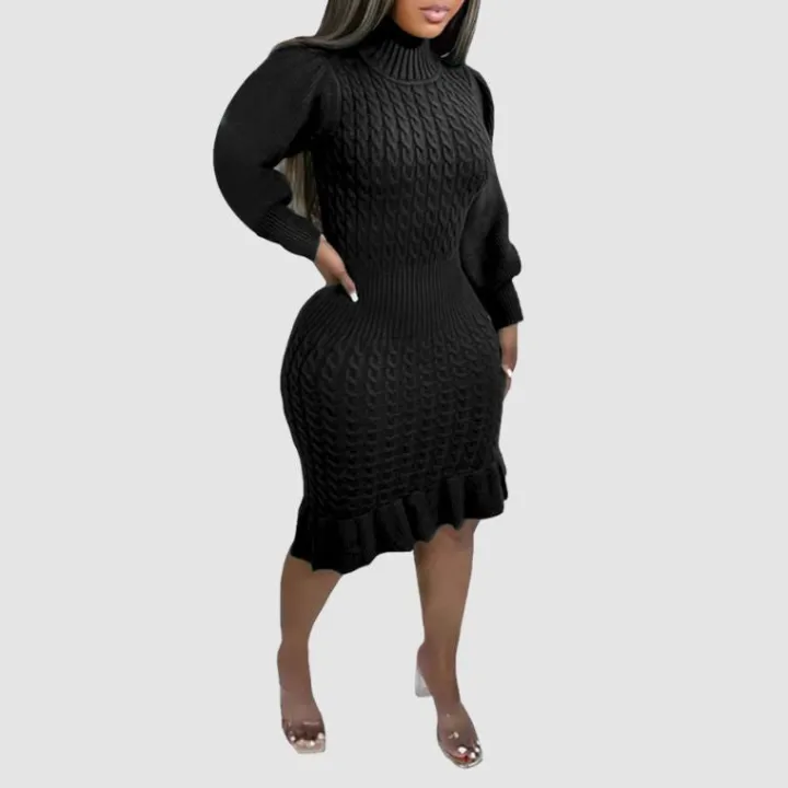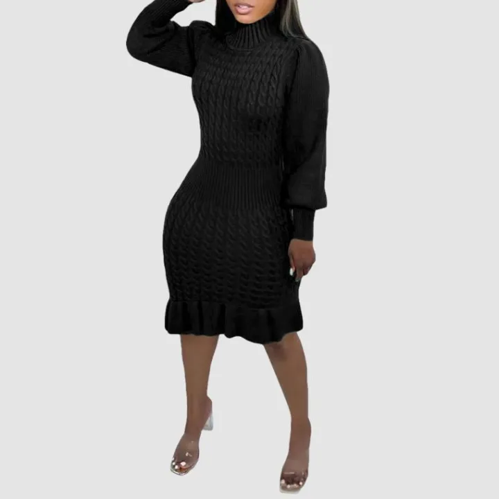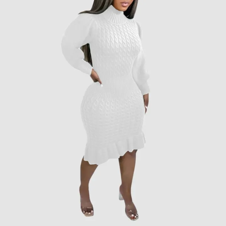 Features: Dress, crew neck, turtleneck, jacquard wavin, long sleeves, high waist, ruffled hem, solid color, bodycon, maxi dress.