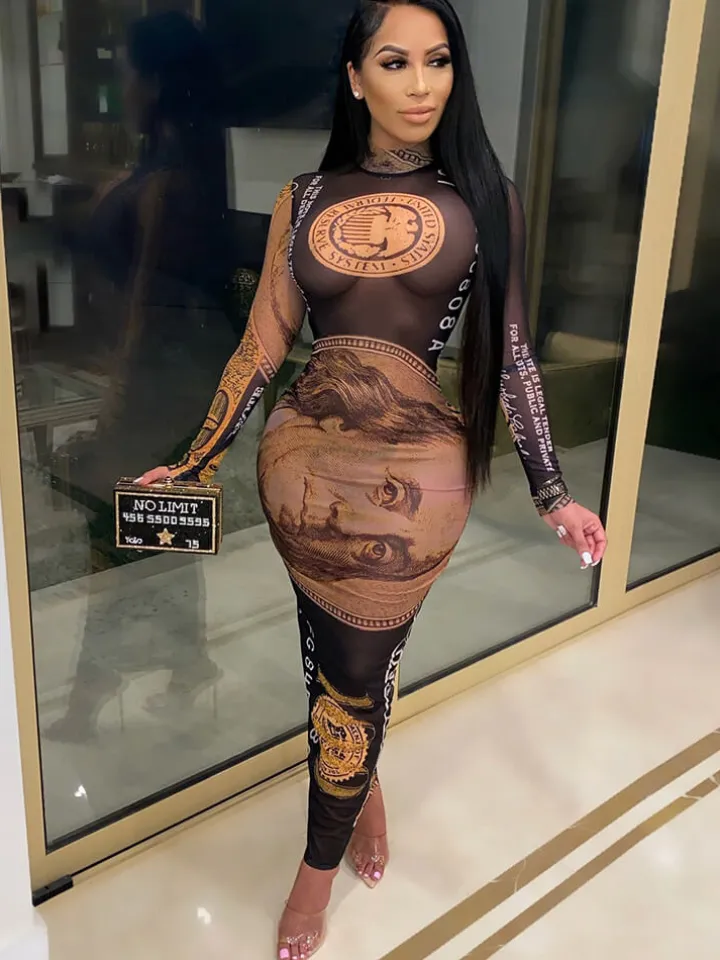 - Feature: Stand collar, dollar print, back zipper, long sleeve, sheer mesh see-through, sexy club maxi dress.