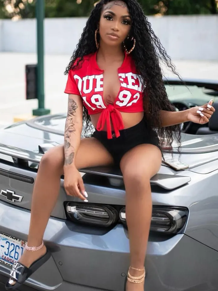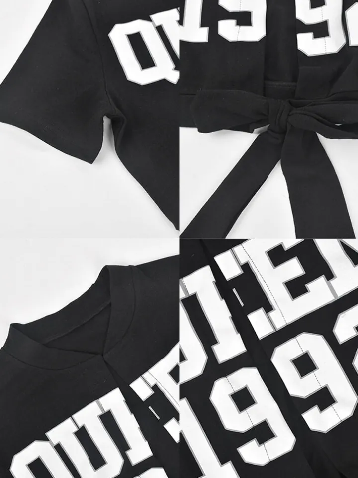 Features: Short sleeve, solid color, letter print, lace-up, open front, casual, crop tops.