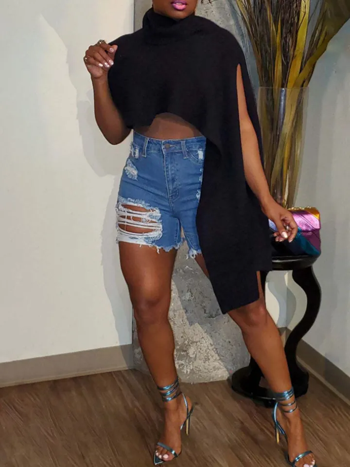 Features: Sleeveless, turtleneck, asymmetrical hem, knit, solid color, loose sweater, crop top.