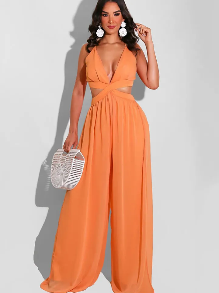 Spaghetti Strap Chiffon Backless Wide Leg Jumpsuit