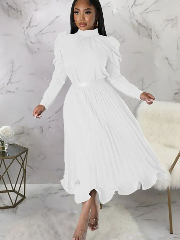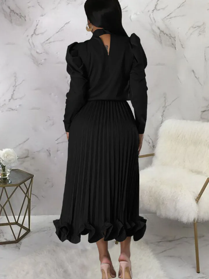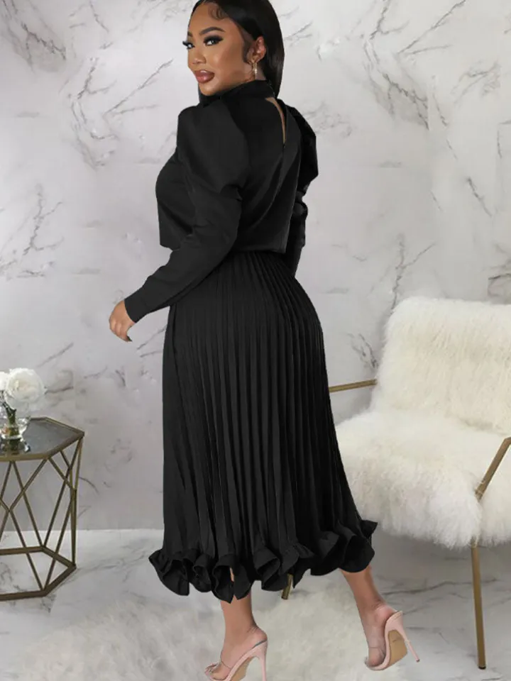 Features: Two-piece outfits, long sleeves, knot, mock neck, crop top, solid color, high waist, pleated, ruffle maxi skirt.