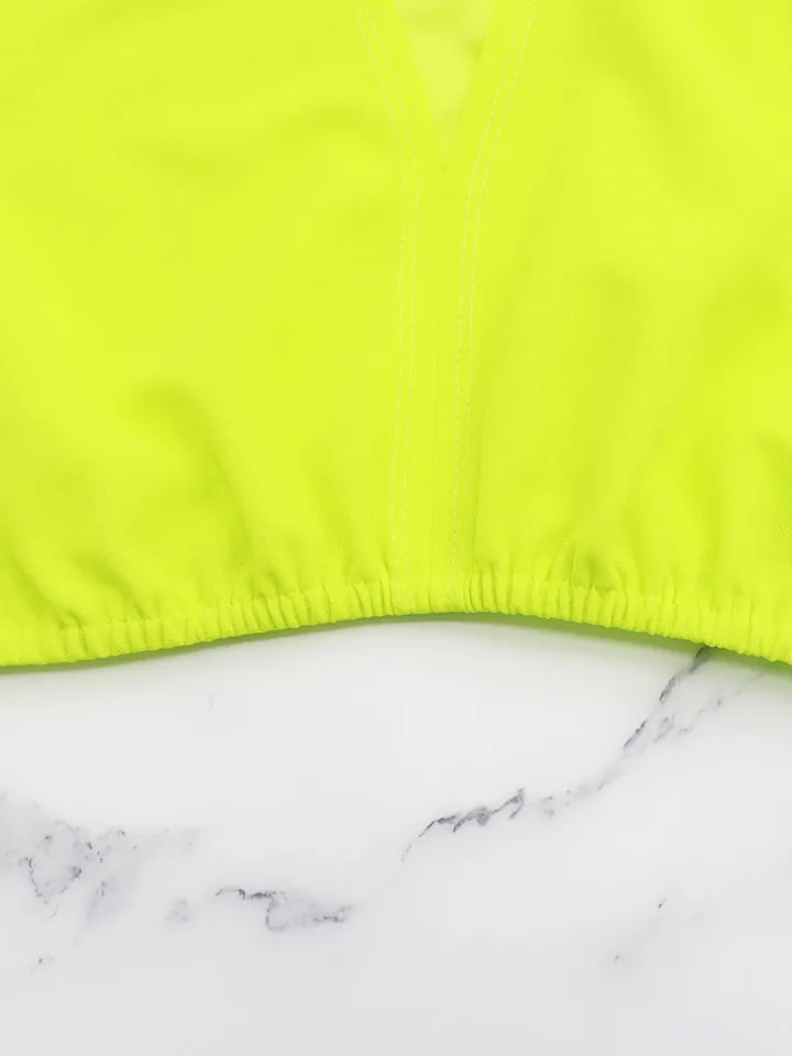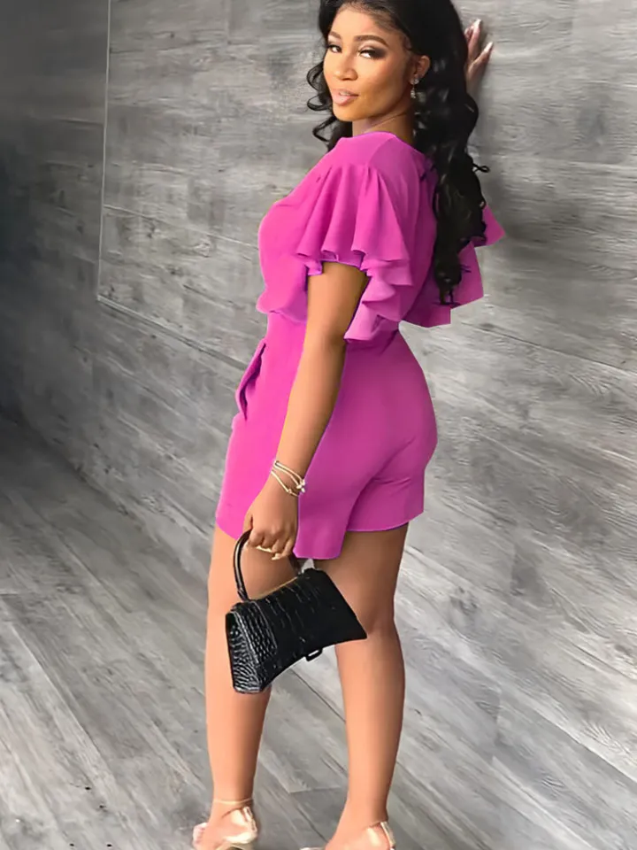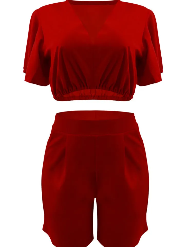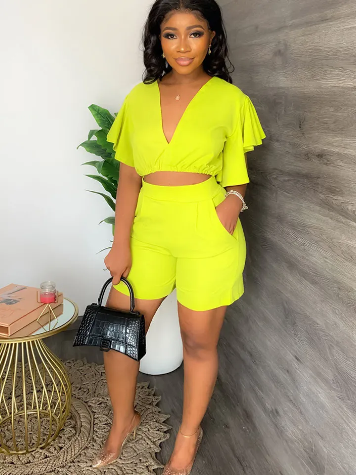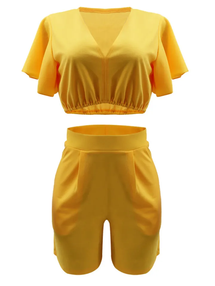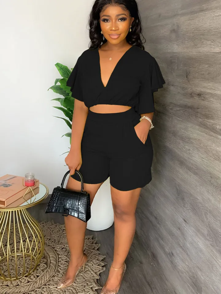 Feature: Two-piece outfits, deep v neck, ruffle sleeves, crop top, solid color, high waist, short pants with pockets.