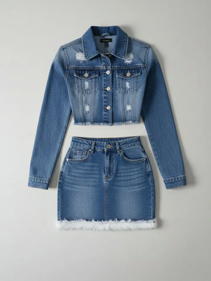 Be the first to review “Two Piece Denim Cropped Jacket Feather Skirt Sets” Cancel reply
