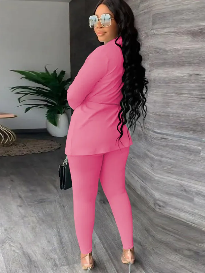 Features: Long sleeve, lapel, drawstring, solid color, blazer, bodycon long pants, two-piece outfits.