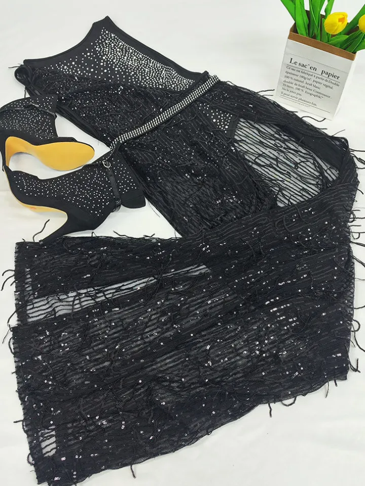 Features: Two-piece outfits, glitter, rhinestone, sleeveless, romper, mesh, one-shoulder, tassels, floor-length, side-split, solid color, maxi dress.