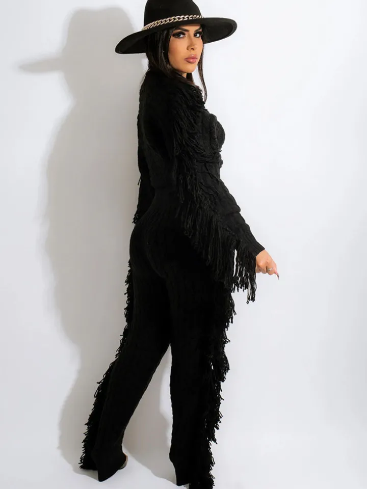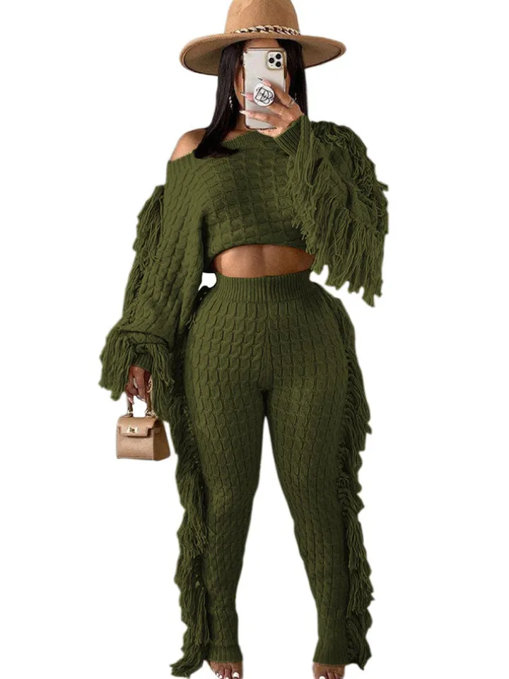 Feature: Long sleeve, crop top, solid color, knitted, tassel, long pants, bodycon, slim, two-piece outfits.