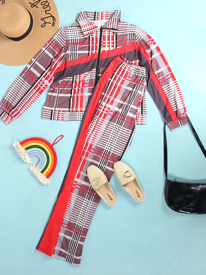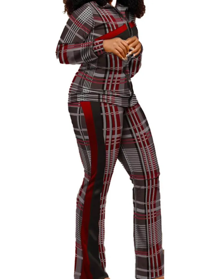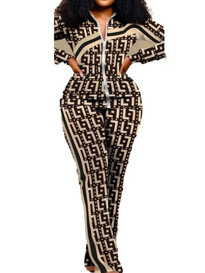 Feature: Geometric, camouflage, leopard, striped, long sleeve, zip up, bodycon, jackets, pants suit, two-piece outfits.