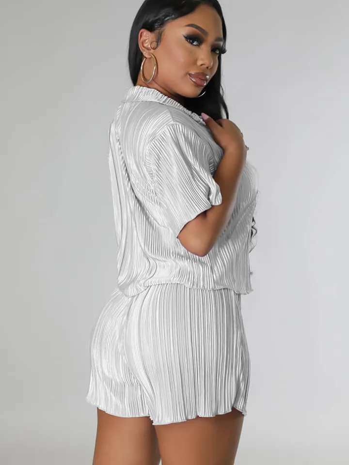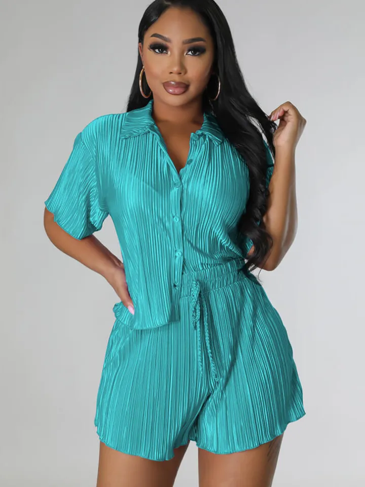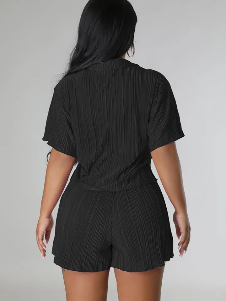 Feature: Solid color, short sleeve, button, pleated, ruched, high waist, short pants, two-piece outfits.