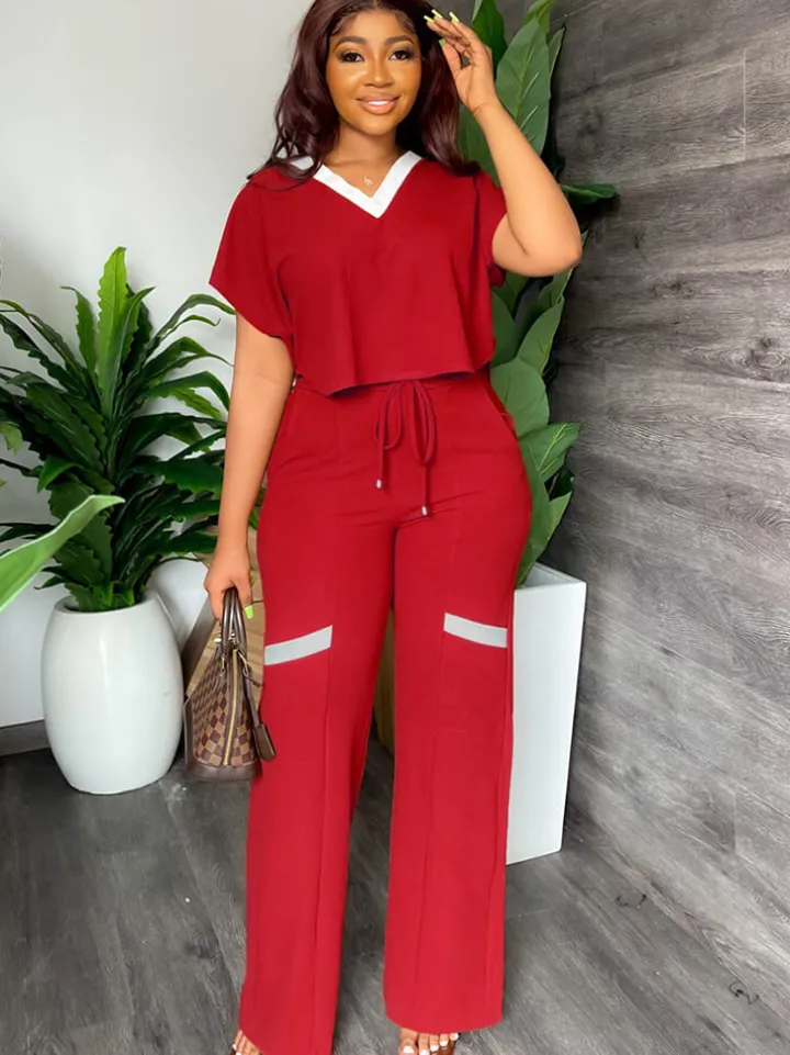 Feature: Patchwork, short sleeve, color block, crop top, drawstring, bodycon, pants suit, two-piece outfits.