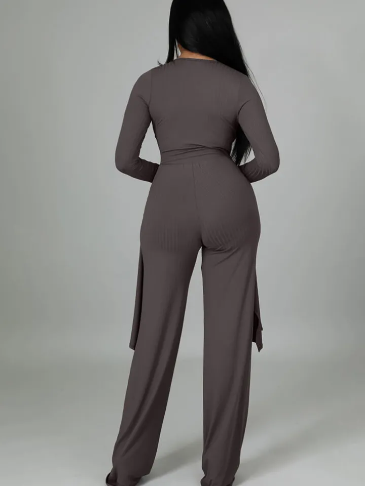 Features: Elastic waist, slim fit, two-piece outfits, long sleeve, v-neck, lace-up, asymmetrical, floor-length, loose, wide-leg, flare pants, solid color.