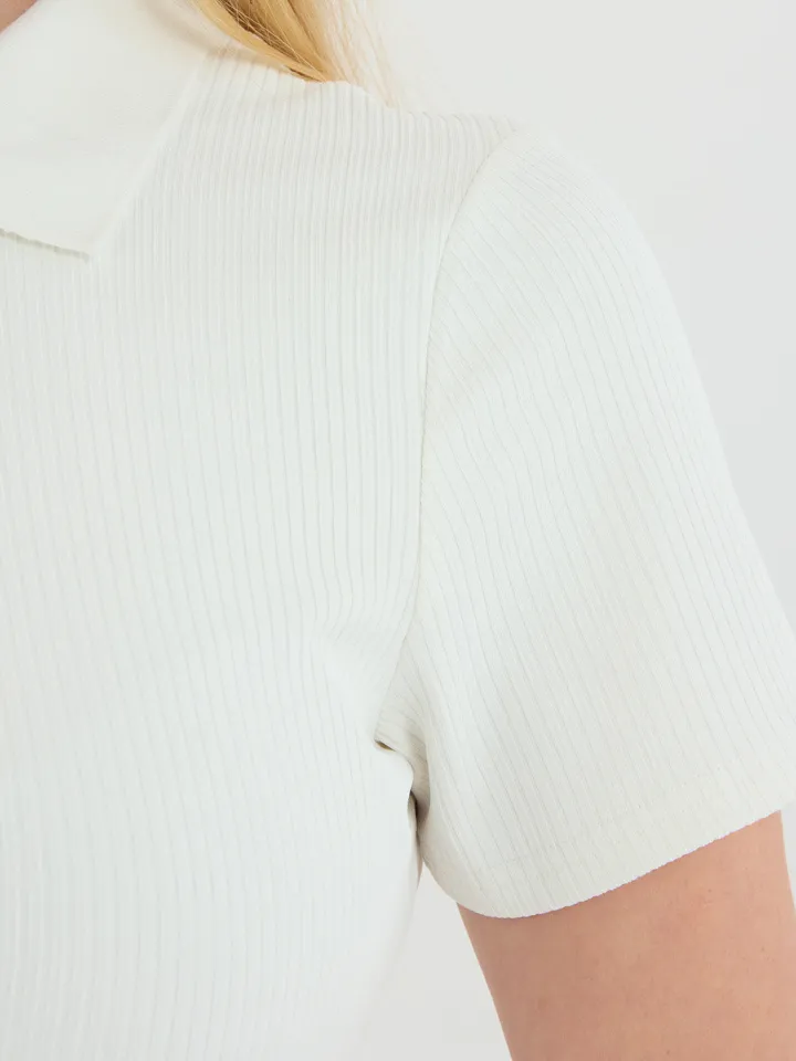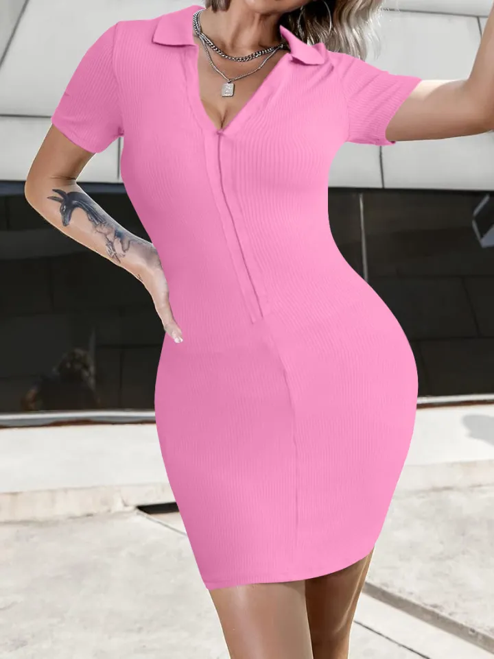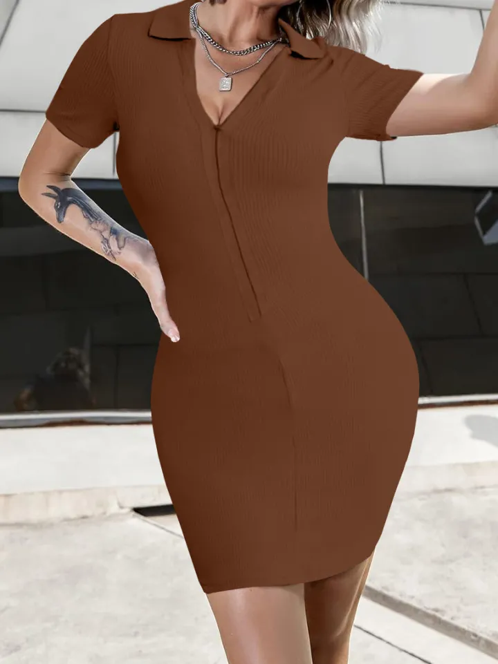 V-Neck Ribbed Striped Zipper Solid Color Mini Dress