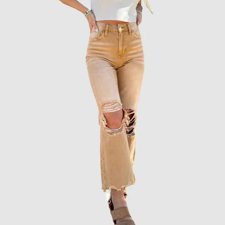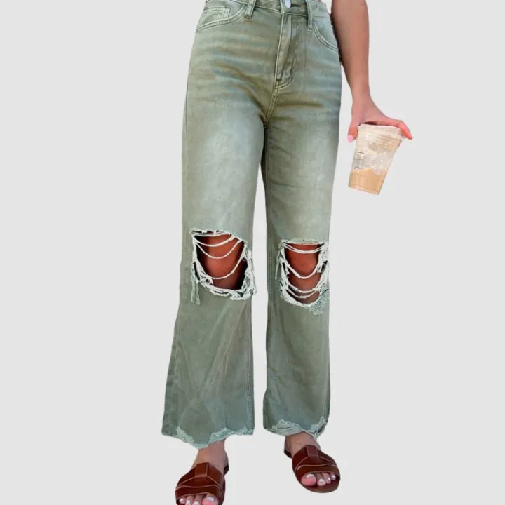 Features: Pants, jeans, ripped design, bootcut design, washed, denim fabric, high waist, straight-leg, wide leg, relaxed fit, solid color, zipper front, unisex, couple outfits.