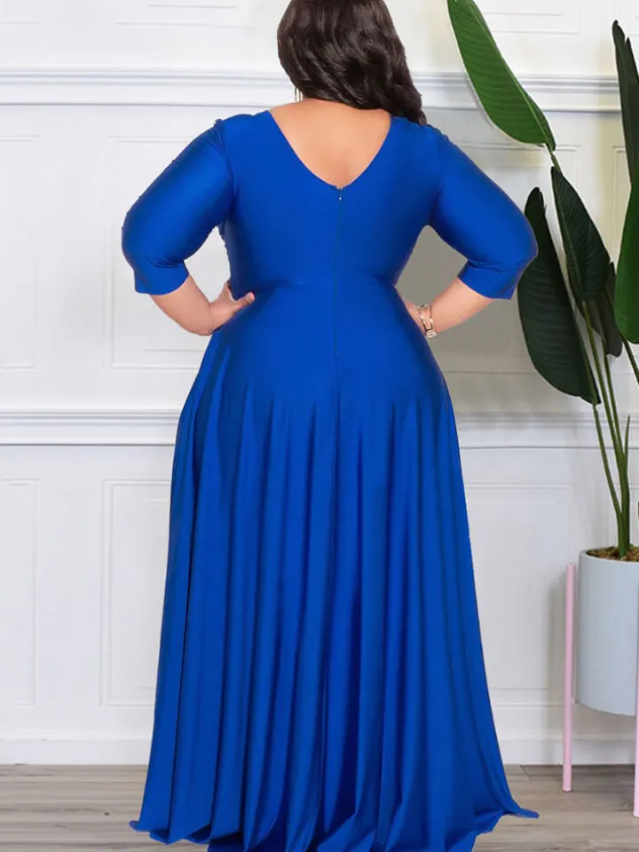 Feature: Bracelet sleeve, v-neck, ruched, solid color, ruffle, maxi dress. Unique style makes you fashionable.