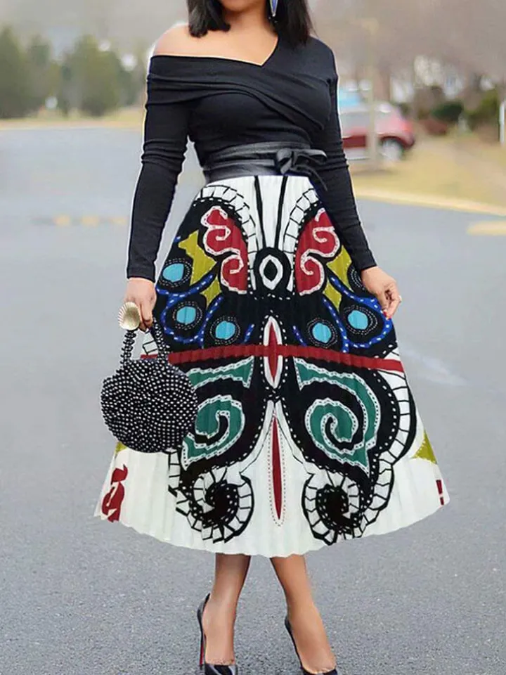 Feature: Elegant, graffiti, high waist, cartoon printed, elastic waist, midi pleated skirts, striped, party, clubwear, casual, summer.