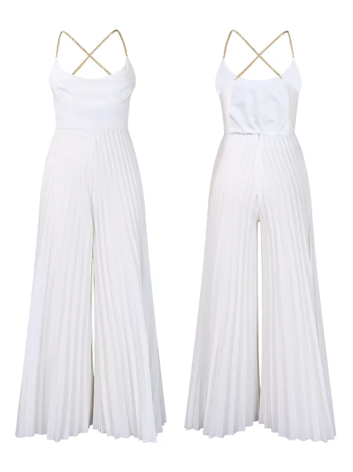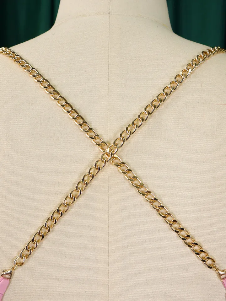 - Top: Chain halter, open back, sleeveless
