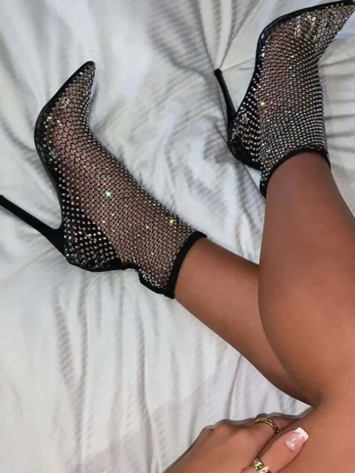 Fishnet Hollow Out Rhinestone Heel Boots