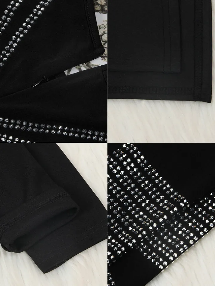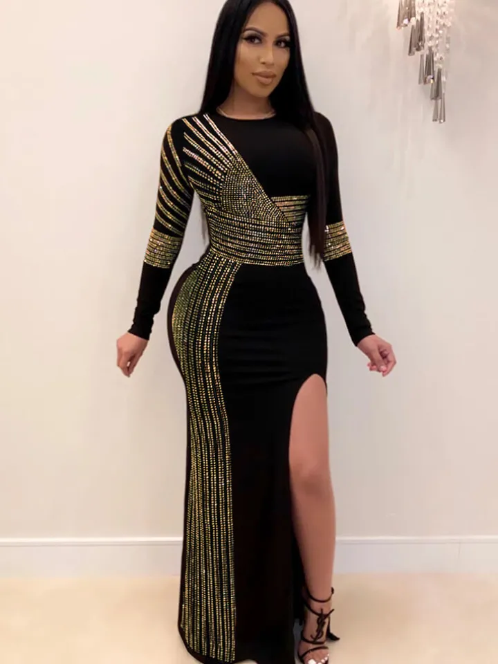 Feature: Round neck, long sleeve, full of stretch, not see-through, high split, back zipper closure, sparkly rhinestone embellishment glittery rhinestones, hot drilling.