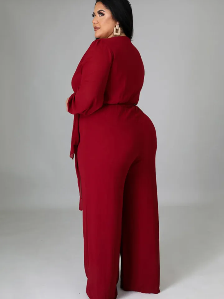 Feature: Solid color, long sleeve, v-neck, tie up, ruched, bodycon, wide leg jumpsuits.