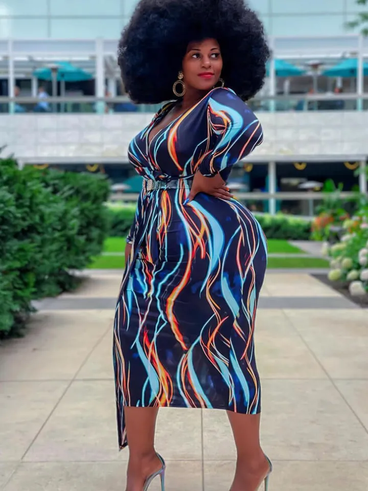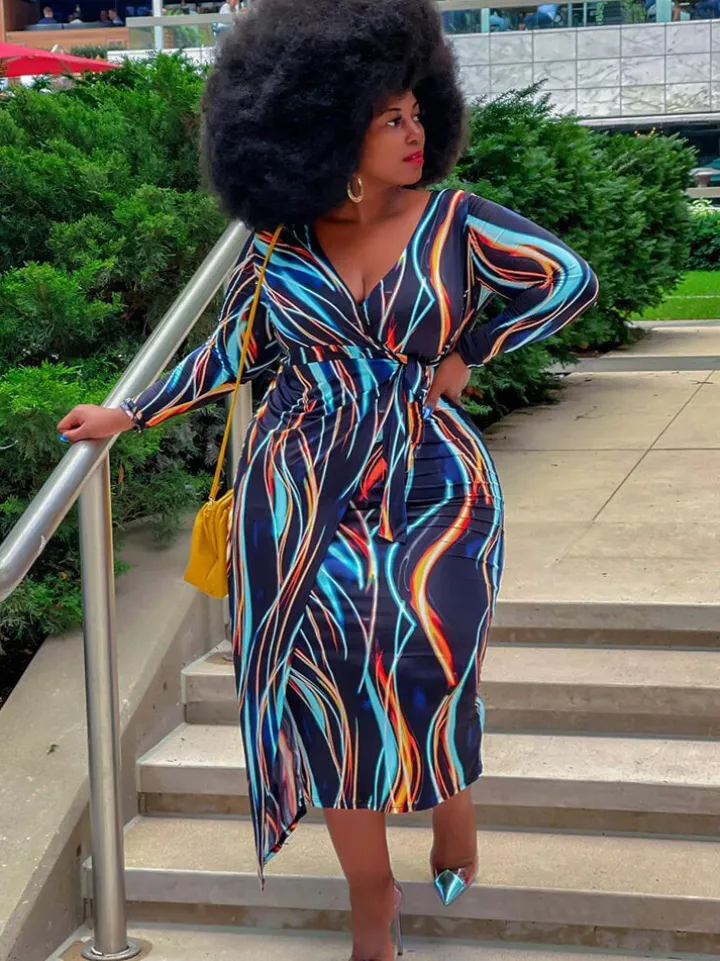 Feature: Long sleeve, colorful, v neck, casual, lace up, bodycon, striped print, midi dress, belt. Unique style makes you fashionable.