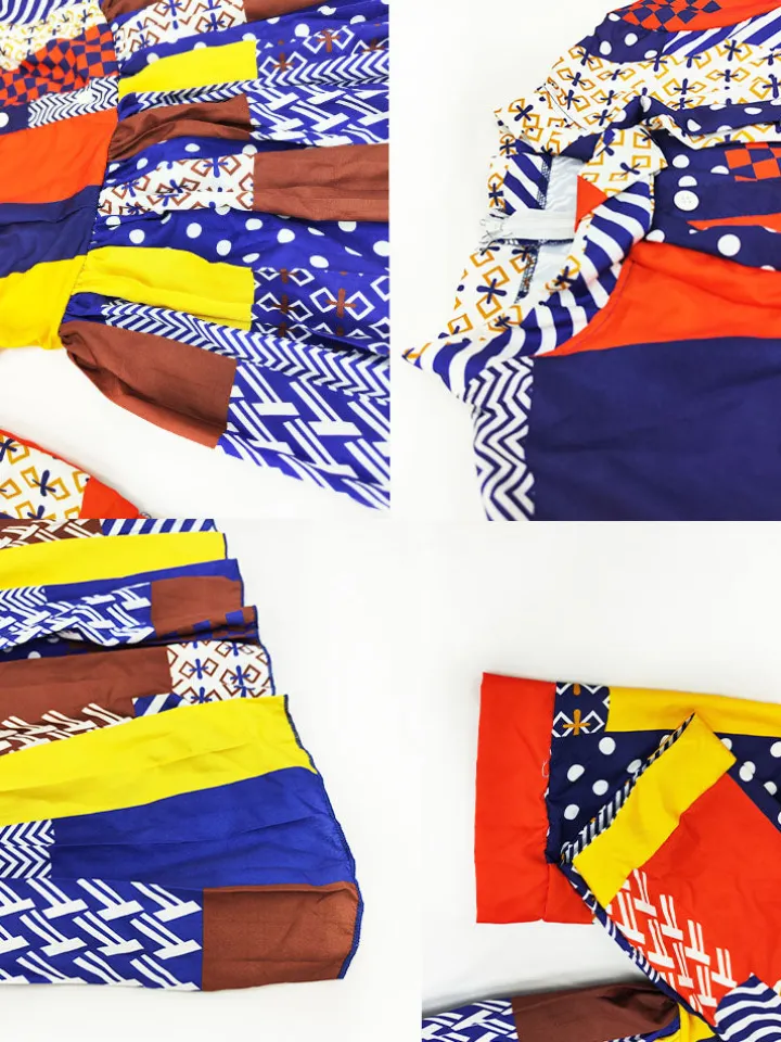 Features: No stretchy, long sleeves, figure print, color block, patchwork, high waist, midi dress.
