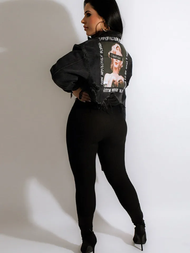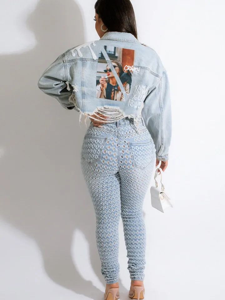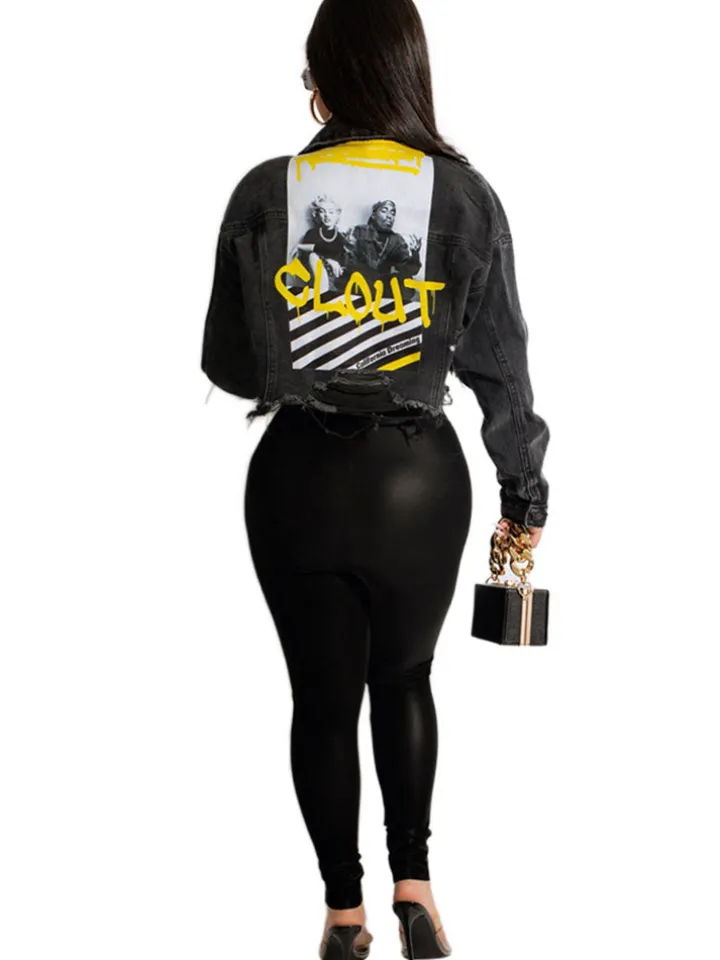 Features: Long sleeves, lapel, button, ripped, print, short denim jacket.